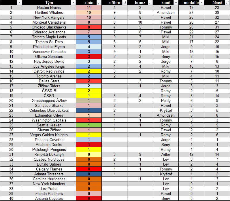 MEDAILOVÉ POŘADÍ NA TURNAJÍCH KALICHU